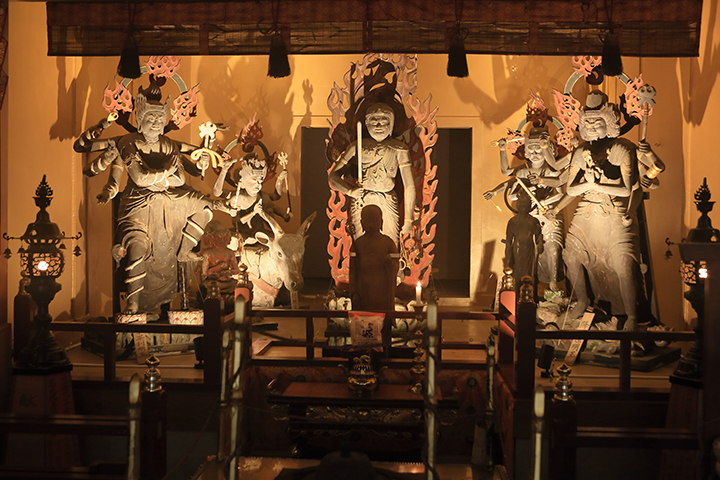 木像 中央大聖不動明王、降三世、軍茶利、大威徳、金剛夜叉の各明王をおがむことができる。